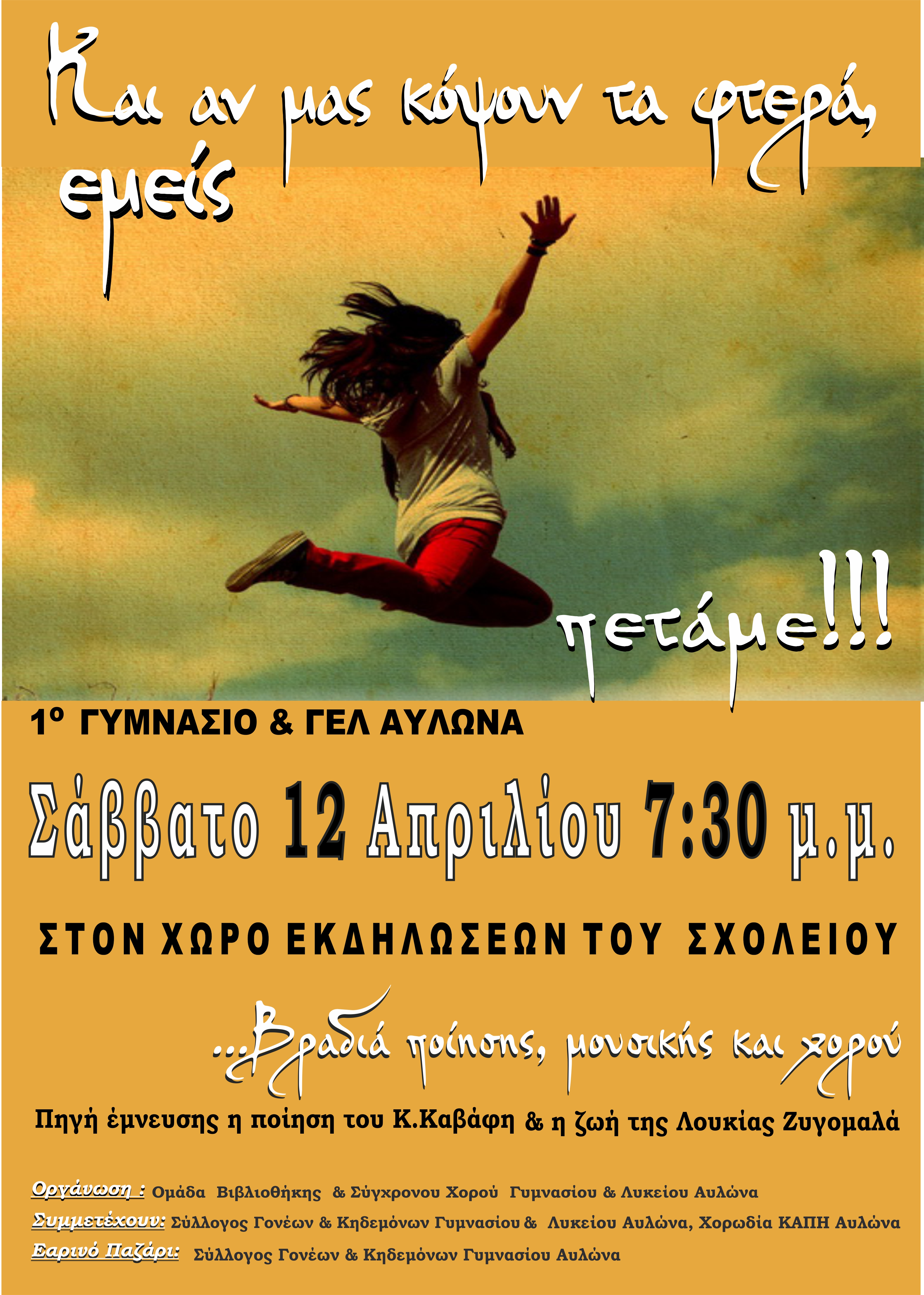 Σάββατο 12 Απριλίου στις 7.30 μ.μ. στο θέατρο του σχολείου.