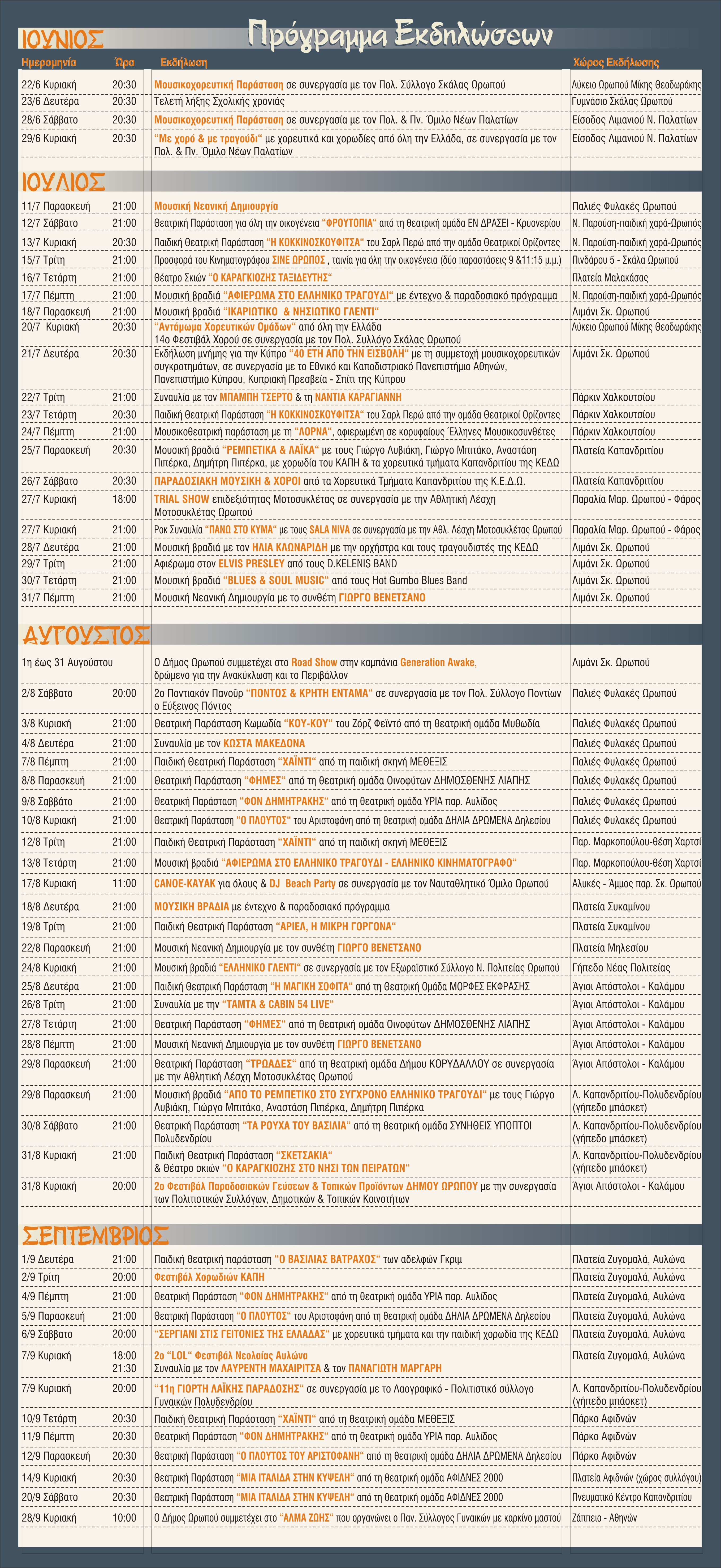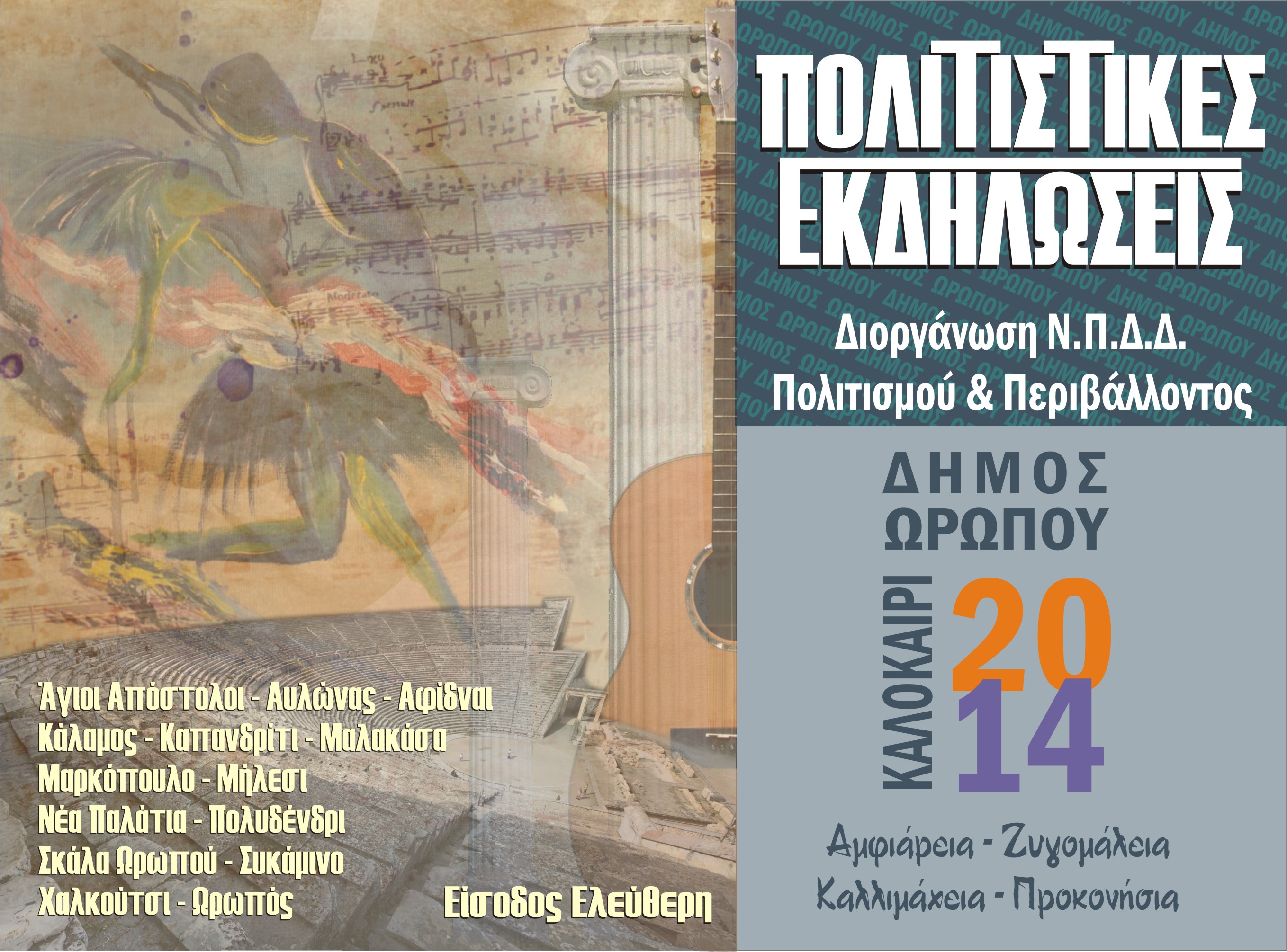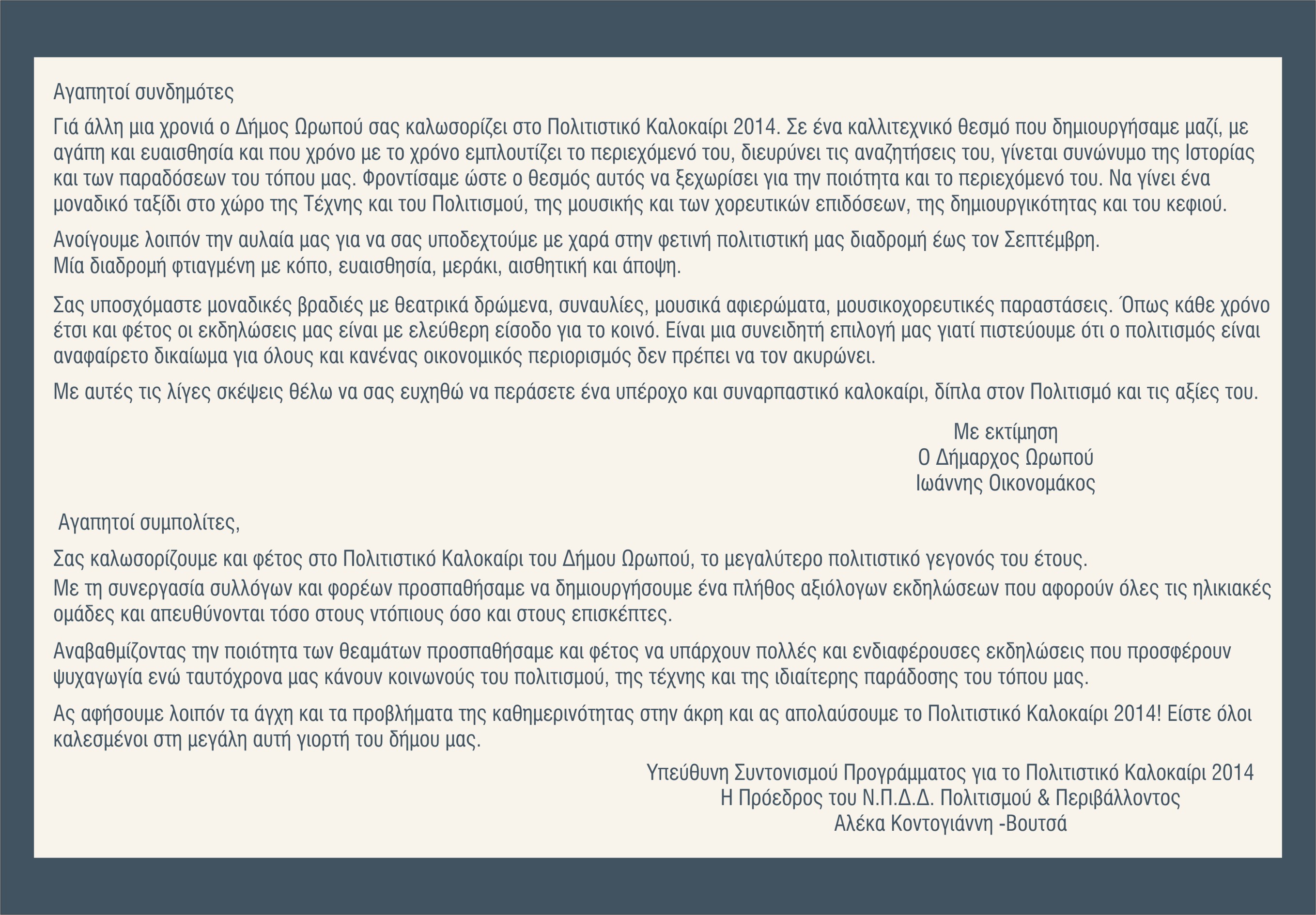 Δελτία Τύπου Ανακοινώσεις Επικαιρότητα κάντε κλικ να δείτε το πρόγραμμακάντε κλικ να δείτε την αφίσακάντε κλικ να δείτε τα μηνύματα Δημάρχου Ωρωπού και Προέδρου ΝΠΔΔ