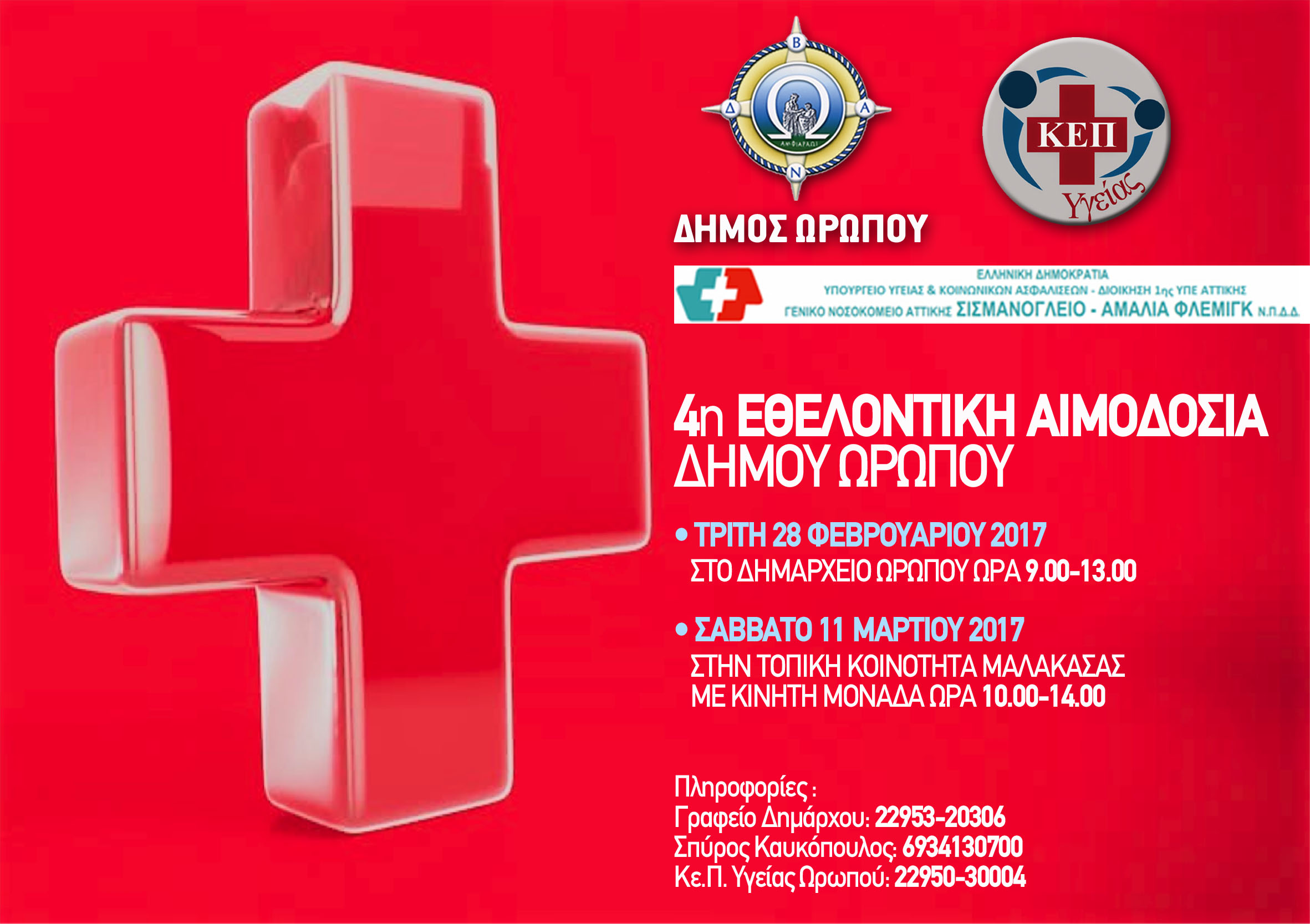 ΑΝΑΚΟΙΝΩΣΗ-ΠΡΟΣΚΛΗΣΗ στην 4η Εθελοντική Αιμοδοσία του Δήμου Ωρωπού στις 28 Φεβρουαρίου & 11 Μαρτίου 2017