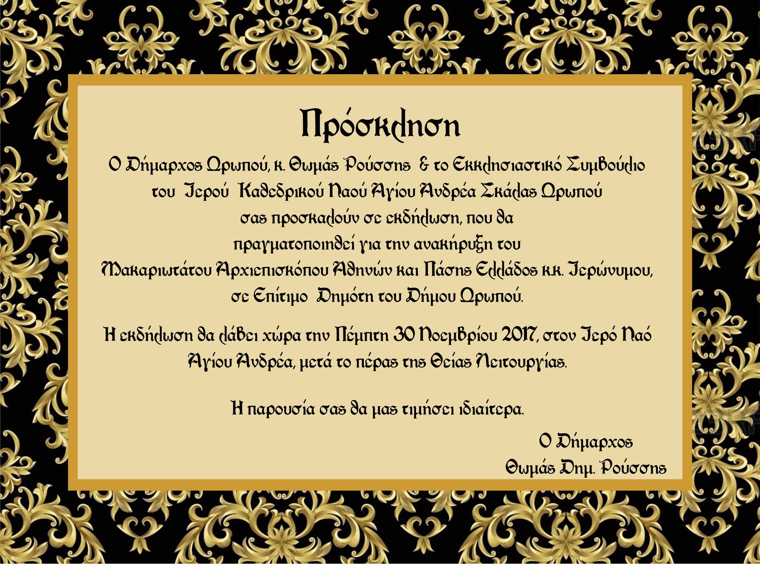 Πρόσκληση Εκδήλωσης Ανακήρυξης Μακαριώτατου Αρχιεπίσκοπου Αθηνών & Πάσης Ελλάδος σε Επίτιμο Δημότη του Δήμου Ωρωπού.