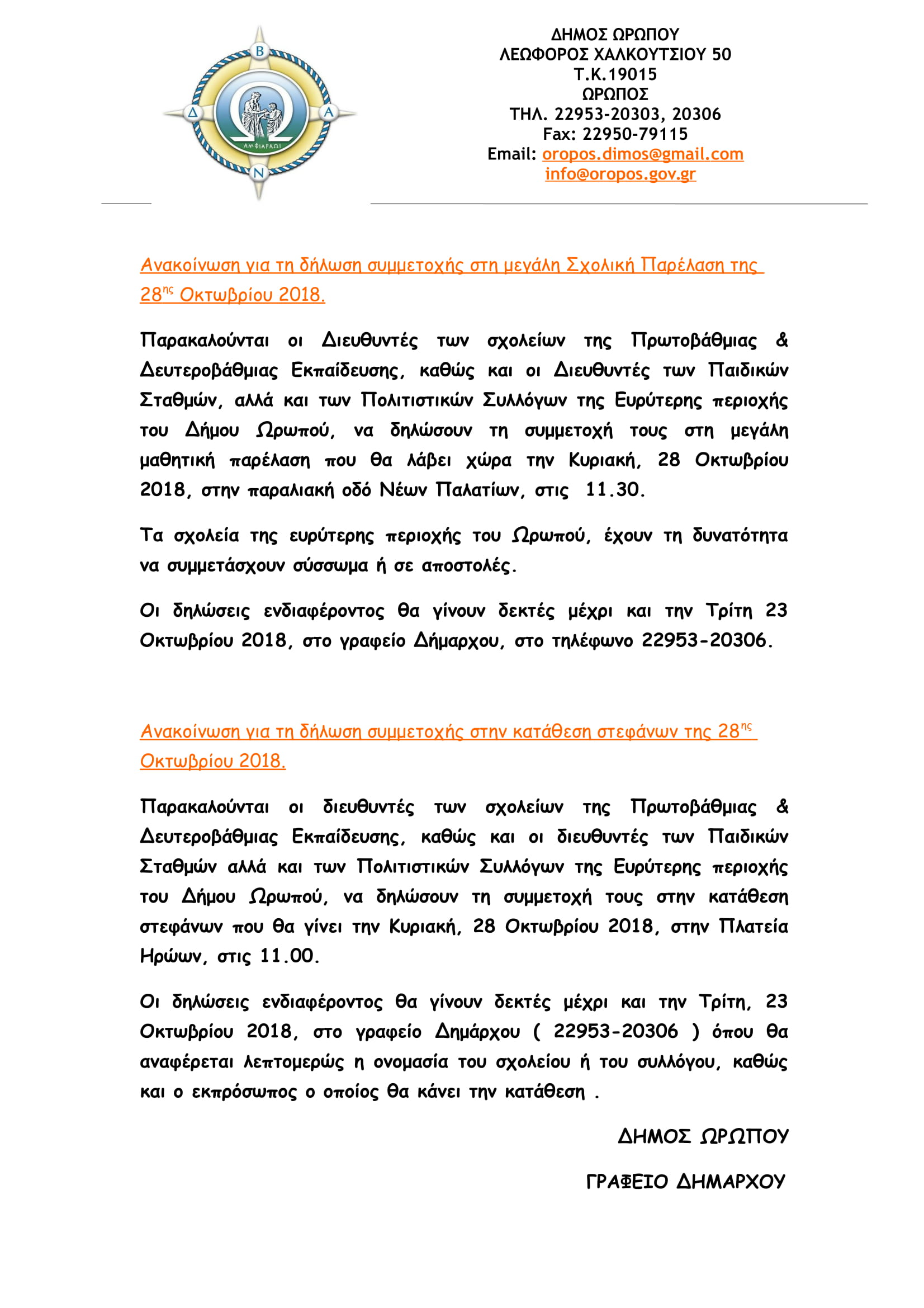 ΑΝΑΚΟΙΝΩΣΗ ΣΥΜΜΕΤΟΧΗΣ ΣΤΗΝ ΠΑΡΕΛΑΣΗ ΤΗΣ 28ης ΟΚΤΩΒΡΙΟΥ 2018