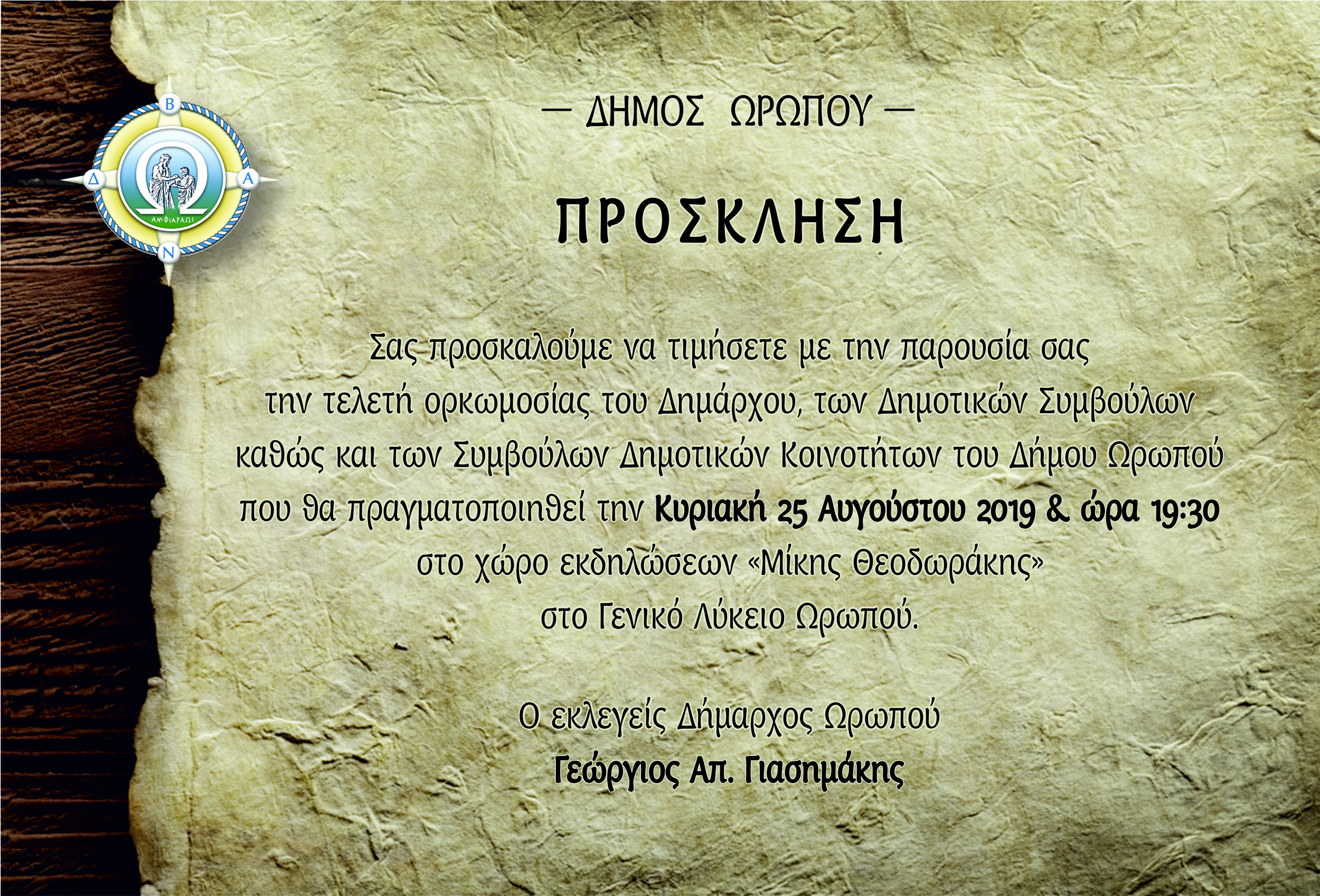 ΠΡΟΣΚΛΗΣΗ ΟΡΚΩΜΟΣΙΑΣ ΔΗΜΑΡΧΟΥ ΚΑΙ ΔΗΜΟΤΙΚΩΝ - ΚΟΙΝΟΤΙΚΩΝ ΣΥΜΒΟΥΛΩΝ ΩΡΩΠΟΥ ΣΤΙΣ 25/08/19, 07:30 μμ στην αίθουσα "Μίκης θεοδωράκης" του Γεν.Λυκείου Ωρωπού