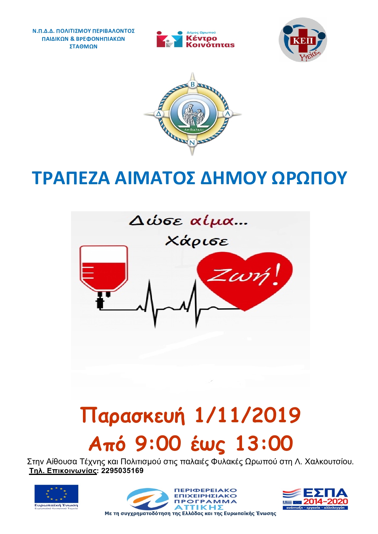 ΑΝΑΚΟΙΝΩΣΗ ΕΘΕΛΟΝΤΙΚΗΣ ΑΙΜΟΔΟΣΙΑΣ ΔΗΜΟΥ ΩΡΩΠΟΥ την 01 Νοεμβρίου 2019