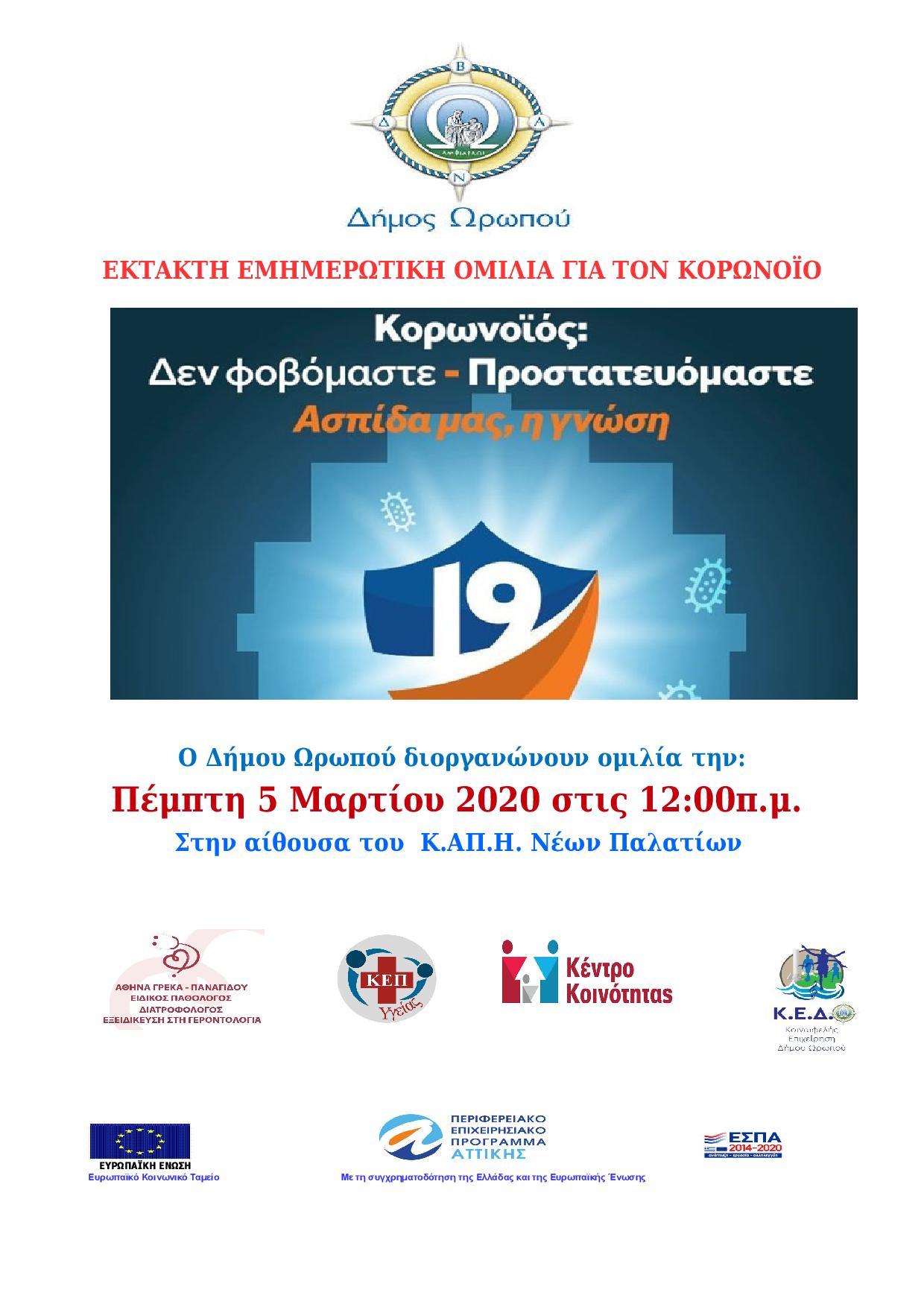 ΑΝΑΚΟΙΝΩΣΗ: Έκτακτη Ενημερωτική ομιλία για τον Κορωνοϊό στις 5 Μαρτίου στις 12 το μεσημέρι στο ΚΑΠΗ Νέων Παλατίων.